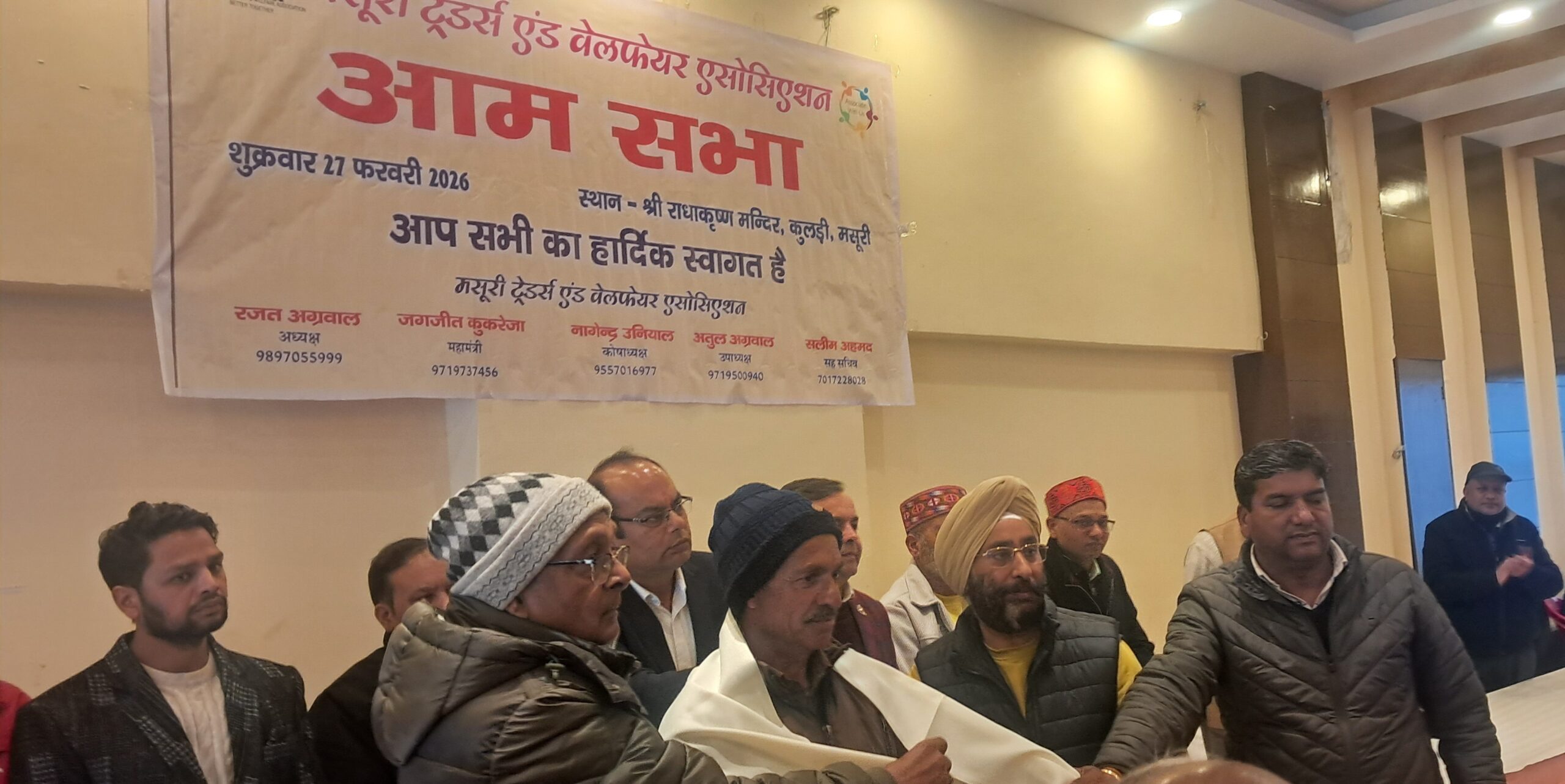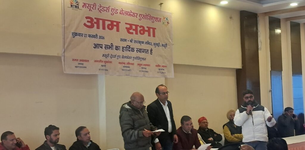 मसूरी ट्रेडर्स एंड वेलफेयर एसोसिएशन की आम सभा राधाकृष्ण मंदिर के सभागार में आयोजित की गयी जिसमें अध्यक्ष रजत अग्रवाल ने सभी व्यापारियों का स्वागत किया। इस मौके पर उन्होंने व्यापारियों के हितो के बारे में कराये गये कार्यों पर विस्तार से अवगत कराया गया। इस मौके पर महामंत्री जगजीत कुकरेजा ने एसोसिएशन के द्वारा व्यापारियों के हितों में कराये गये कार्यो पर विस्तार से प्रकाश डाला वहीं कोषाध्यक्ष नागेद्र उनियाल ने आय व्यय का ब्योरा प्रस्तुत किया जिसे सर्व सम्मति से पास किया गया। इस मौके पर व्यापारियों ने सुझाव भी दिए व समस्याओं को भी रखा।