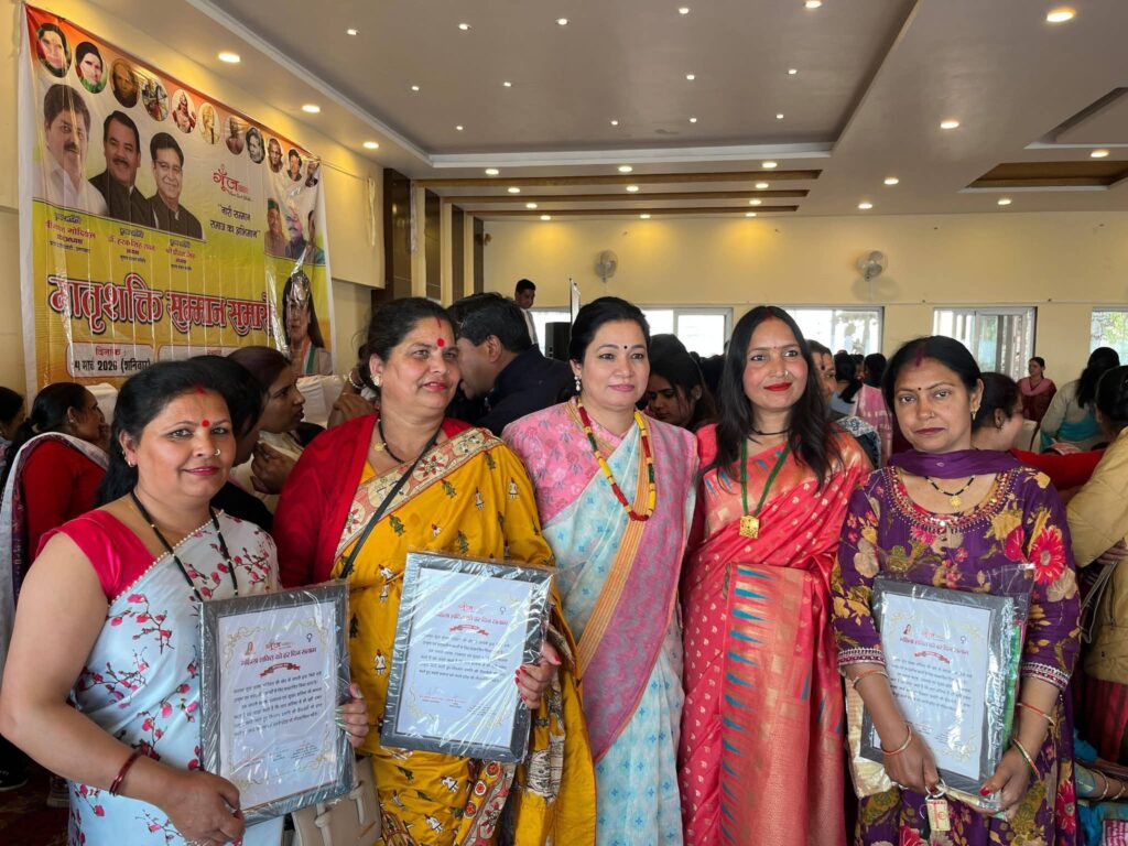 मसूरी। राधाकृष्ण मंदिर सभागार में गूंज संस्था के द्वारा आयोजित मातृशक्ति सम्मान कार्यक्रम का आयोजन किया गया जिसमें मसूरी की धार्मिक, सामाजिक, सांस्कृतिक व उत्कृष्ट कार्य करने वाली महिलाओं को नारी का सम्मान समाज का अभिमान के तहत गुलदस्ता, शाल व सम्मान पत्र देकर मुख्य अतिथि पूर्व मंत्री हरक सिंह रावत, पूर्व विधायक जोत सिंह व अतिथियों के हाथों सम्मानित किया गया।