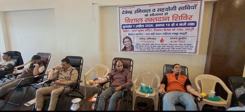 मसूरी। जय बद्री केदार महिला समूह व समाज सेवी देवेंद्र उनियाल व सहयोगी युवाओं के तत्वाधान में राधाकृष्ण मंदिर सभागार में परिवर्तन चेरिटेबल ब्लब सेंटर के सहयोग से रक्तदान शिविर लगाया गया जिसमें 150 से अधिक लोगों ने रक्तदान किया। शिविर का उदघाटन भाजपा मंडल अध्यक्ष रजत अग्रवाल, रोटरी सचिव योगिता गोयल, समाजसेवी देवेद्र उनियाल एवं जय बद्री केदार महिला समूह की अध्यक्ष लक्ष्मी उनियाल ने रीबन काटकर किया। ं